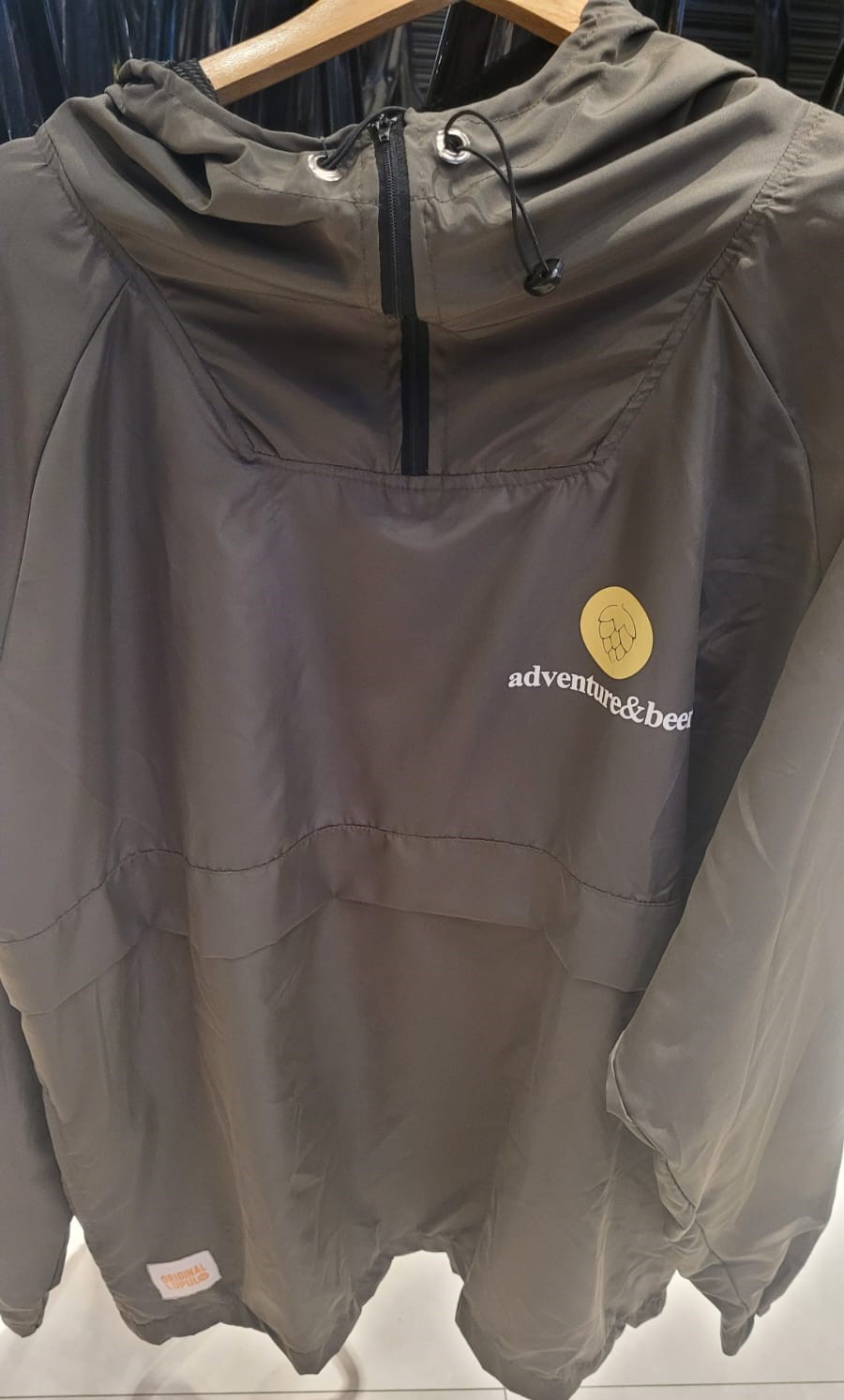 Corta-vento com tecido impermeável, todo com forro e zíper no capuz.