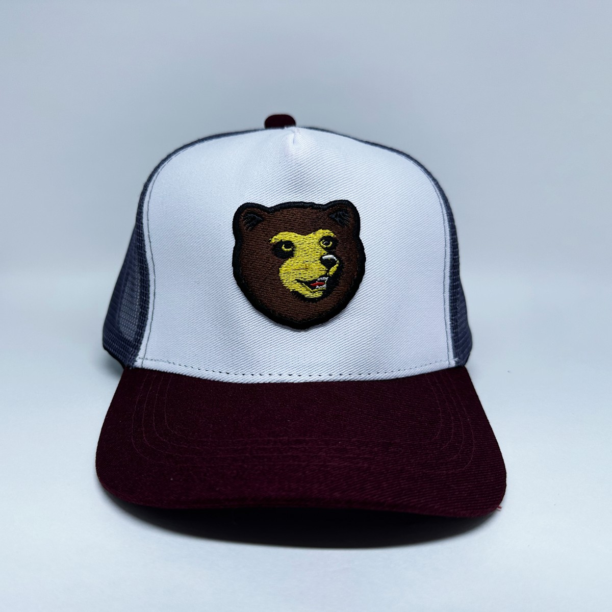 Boné Cervejaria Colorado Branco com logo bordado, aba vinho e tela cinza.